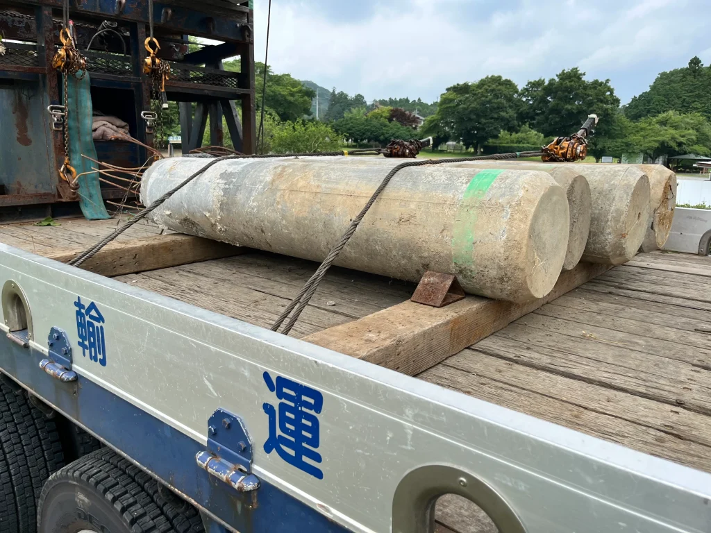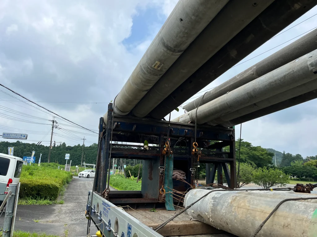 一本ずつ慎重に吊り上げ、大型トラックの荷台へ確実に固定しながら積み込みを行いました。周辺の安全確保を徹底し、スムーズに撤去を完了いたしました。